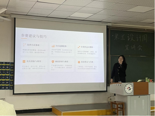 为了让同学们的参赛之路更加顺畅,宣讲会的最后环节,王小月老师详细介绍了参赛建议与技巧。她建议同学们选择合适赛道,根据自身优势在专项、命题或非命题赛场中做出最优选择;关注选题趋势,紧跟时代脉搏,将传统文化创新、可持续发展等热点融入设计;注重作品完整性,确保从概念构思到最终呈现的逻辑闭环。同时,她还强调了优化排版与视觉、确保原创与规范以及提前准备与打磨的重要性,提醒同学们避免踩坑,提升作品的专业度。