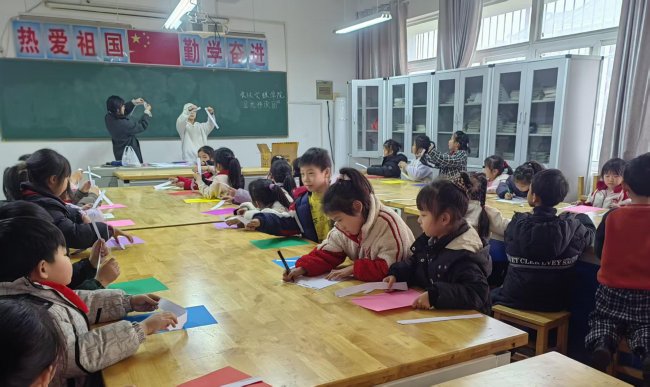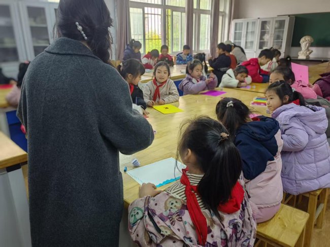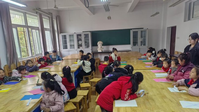 志愿者们早早地来到教室,精心布置场地,将一张张长条形的白色卡纸、彩色的卡纸、五彩的马克笔整齐地摆放在每个孩子的桌前。他们弯下腰,耐心地指导着每一个孩子:“把纸条卷一卷,再粘一粘,就能变出小花的茎啦!”面对孩子们的疑问,志愿者们总是不厌其烦地一遍遍示范,直到孩子们成功完成第一步。