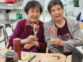 活动室里,欢声笑语此起彼伏。老人们一边绘制,一边分享自己与戏曲、与拨浪鼓相关的往事,气氛温馨感人。创作完成后,老人们拿着自己填好的作品,互相展示着、夸赞着,脸上漾起孩童般灿烂的笑容。有人指着画里的花朵,说起年轻时种花的往事;有人拿着填好的脸谱波浪鼓,说起从前的故事。志愿者们静静聆听着这些跨越时光的故事,在一来一往的交流里,心与心的距离被悄然拉近,整个空间都被温情与暖意包裹。