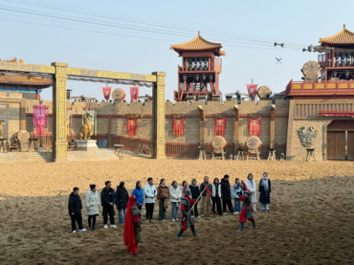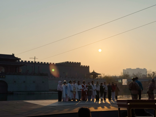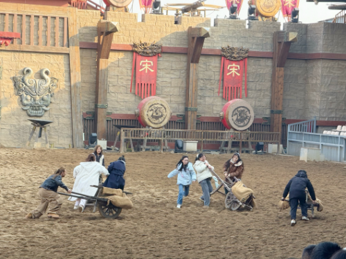 从博物馆的历史沉淀中抽离,转身便踏入“清明上河园”的热闹繁华。这里是《清明上河图》的实景复刻,一步一景皆是宋韵风情。园区里的剧目表演,更是把大宋的豪迈与浪漫演到了极致。《岳飞枪挑小梁王》绝对是必看的重头戏。在剧目正式开始前的暖场环节,我院不少学生积极参与其中,和现场工作人员互动打卡,瞬间点燃了周围观众的热情,为整场演出拉开了精彩序幕。演出开场后,骏马奔腾,战鼓擂响,岳飞一身戎装威风凛凛,与小梁王在演武场上策马交锋,枪尖相碰的铿锵声、演员们的嘶吼呐喊声,瞬间将人拉回那个金戈铁马的热血年代。